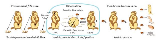 Figure 2: A shift of the Yersinia pseudotuberculosis 0:1b clone to the new ecological niche. The source of FESLF traumatic infection of the Mongolian marmot during hibernation was the excrements, which is accumulated in the toilet chambers in wintering burrows and used to make a burrow ‘plug’ [8, 9]. Body temperature of marmots: in torpor 5оС, in euthermic states 37оС.
