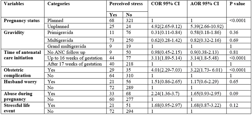 Data were coded and entered into Epidata Version 4.6 before being exported and analyzed in SPSS Version 26. The binary logistic regression employed to find characteristics linked to the perceived stress during pregnancy. In a multivariate logistic regression model, variables with P<0>