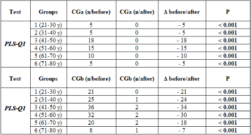 The use of the PLS-Q1 is recommended in clinical settings, as its technical support helps the therapist to more effectively centralise the therapy and intervention on the couple, anche in ragioni di relazioni fortemente disfunzionali o in regime di dipendenza affettiva tossica [31-36]. This assertion is confirmed by the data obtained after the administration of a cycle of 4 psychotherapeutic sessions with a strategic approach and the re-administration of the PLS-Q1 to check for changes, both in an ameliorative and a pejorative sense. The data confirmed the marked improvement in the health intervention between the outcome of the first two sessions (without the use of the data obtained from the questionnaire) and the outcome of the second two sessions (with the use of the data obtained from the questionnaire), with a patient satisfaction index of more than 7/10 using a scaling technique. It was also shown that in the first clinical group (CGa), the cases that were resolved (bringing a concrete benefit of at least 50% improvement over the previous emotional position) were 58/58 (100%), while in the second clinical group (CGb), the cases that were resolved (bringing a concrete benefit of at least 50% improvement over the previous emotional position) were 110/118 (93%). At the clinical interview, it was found that the 8/118 (7%) "resistant" patients had, according to the PICI-3 model, a diagnosis of borderline personality disorder (5/8, 63%), hystrio-narcissistic (2/8, 25%), and bipolar (1/8, 12%), and therefore by their nature not very prone to therapeutic adherence.