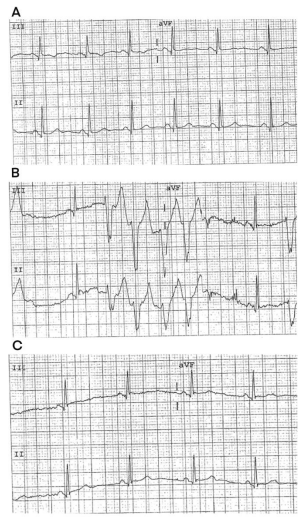 (Figure 1; A, B) This was accompanied by the patient’s identical symptoms of palpitations and pre syncope, as she previously described. The arrythmia and symptoms resolved upon moving from the lateral decubitus position to the supine position.