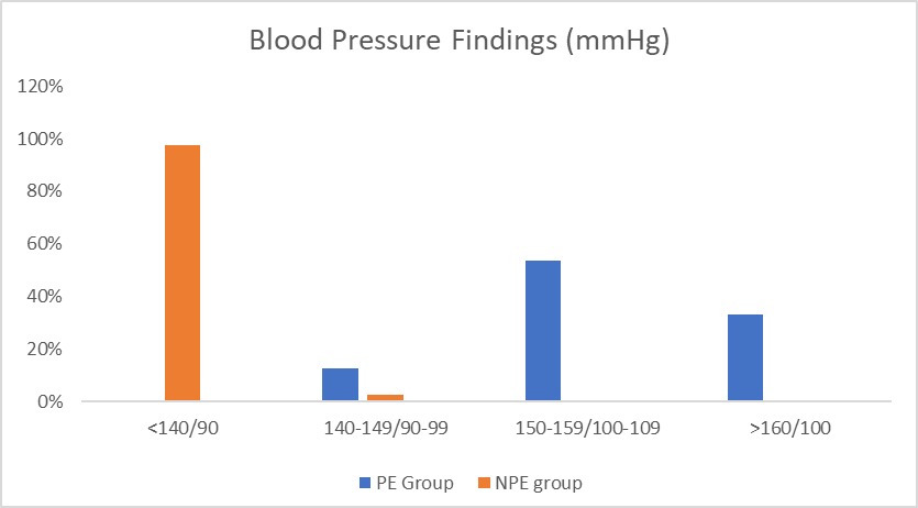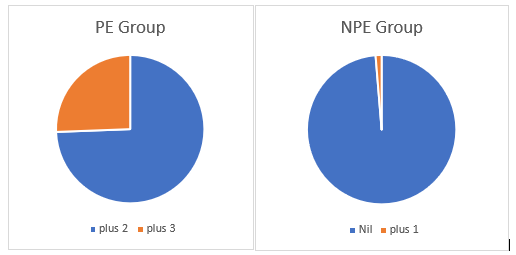 Key: PE- Preeclamptic (+2=74.4%; +3=25.6%); NPE- Non preeclamptic (Nil=98.7%; +1=1.3%) p<0.001