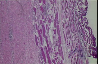 Figure 1: Microscopic examination, H&E stain, 10X: Reveals derivatives of all three germ cell layers, including mature epidermal structures, glandular epithelium (A), bone, cartilage (B), adipose tissue, and seromucinous glands (C), skeletal muscle fibers (D).