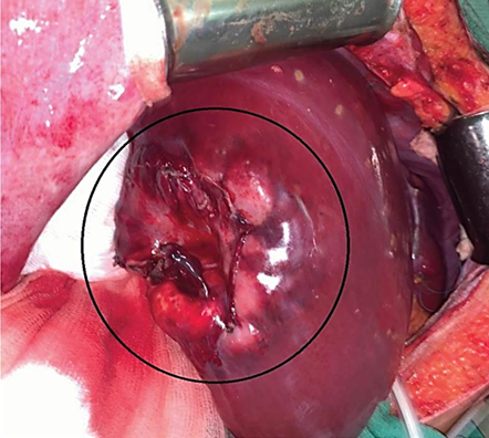 Figure 3. Intraoperative photos: a - a cystic lesion localized along the contour of the liver SVI-VII (indicated by an arrow); b - a solid lesion in the liver SII-III-IVa (indicated by an oval)