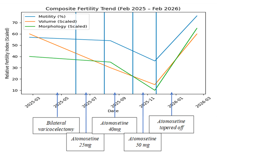 In June 2025, he was prescribed atomoxetine 25mg/day and his dose was optimized to 40 and then to 50mg/day (Figure 1). The patient reported significant improvement in his attention and focus at work without getting irritable as before, reduced impulsivity, and improved mental clarity. He was not a systematic smoker, did not drink alcohol or take recreation drugs, did not take any other medication, supplements or testosterone/anabolic, and he was not exposed to heat (hot-tub/sauna). His BMI was 31 kg/m2, and had no fever or any illness around and during the atomoxetine introduction. He had no history of sexual transmitted infection and his wife was found with no fertility issues. He had no endocrine analysis during this period, except thyroid function testing which was normal in November 2024. No changes in these factors were reported in the observation period.