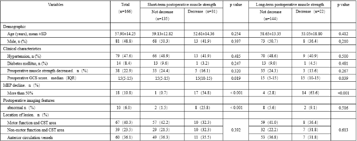preoperative GCS scores and MEP amplitude changes between long-term decreased muscle strength group and non-decreased group (P<0>0.05). Gender, age, hypertension, diabetes mellitus, preoperative changes of muscle strength had no statistical significance on postoperative changes of muscle strength (P > 0.05) (Table 1)