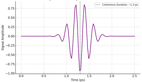 Figure 3: Ramsey interferometry signal showing sustained quantum coherence in the DNA–graphene hybrid system. The signal amplitude peaks at approximately 1.3 ps post-photon emission, indicating the duration of coherent logic state alignment stabilized by the planar configuration of the plasmid strands.