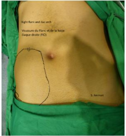 A 29-year-old patient, with no history of disease, consulted for right iliac fossa (RIF) and right thigh root pain, evolving for two weeks. The clinical examination finds a patient in good general condition, apyretic, body mass index (BMI) at 25. Visible and palpable oblong mass occupying right flank, the RIF, and the root of the right thigh; it was firm, painless, adherent to the deep plane, extended on about 20 cm of long axis. There’s a limitation in the extension of the right thigh in relation to psoitis. Digital rectal exam was without anomalies, hernial orifices were free. Abdominal ultrasound showed a multicystic mass of the right iliac psoas muscle, compressive, evoking cystic echinococcosis. Abdominopelvian computed tomography (CT-scann) found a multi-loculate formation, with a bi-sac wall, of the right pelvic retroperitoneum, contained a central calcification, measuring 22.2 cm high by 9.9 cm x 9.5 cm of transverse axis, extending from the retrocecal region to the root of the right thigh through the crural orifice.