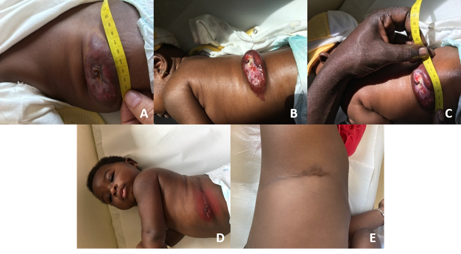 Figure 1: A. Measured from the skin surface, the hemangioma became 8.5 cm x 4 cm. It is growing very fast. B & C. Baby was 3 months and 22 days old, the hemangioma ulcerated. D. 24 days after the operation, when the baby was 5 months old. E. Baby was 4 years and 9 months old. Postoperative evaluations indicated a complete resolution of pain and discomfort. However, persistent leukocytosis and thrombocytosis were observed from the second to the twentieth month of life. Notably, even 2 months and 26 days after the hemangioma surgery, leukocytosis and thrombocytosis were still present and could not be attributed to any other cause. Additionally, the infant experienced nasopharyngitis at 1 year and 4 months of age, with leukocyte and platelet counts of 33.0 x 10⁹/L and 407.0 x 10⁹/L, respectively. These findings pointed to an exaggerated inflammatory response, with no identifiable underlying cause for the leukocytosis or thrombocytosis. C-reactive protein (CRP) values were within expected ranges throughout the entire follow-up period. By 1 year and 8 months of age, complete blood count results returned to normal. The patient continued to be monitored until 4 years and 9 months of age, during which normal growth and developmental milestones were observed (Table 1)