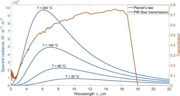 where λ is a wavelength of light, I(λ, T) is the spectral density of electromagnetic radiation emitted by a blackbody in thermalequilibrium at a given temperature T (Planck law),Tfiber is a transmission of PIR fiber, and σ is the Stefan-Boltzmann constant.