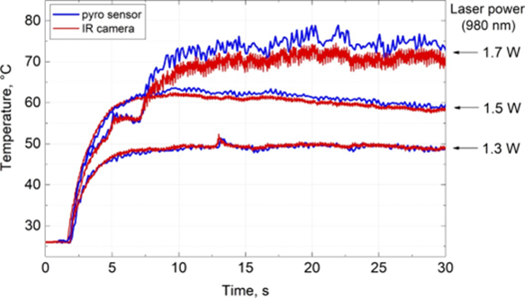 In the simple recalibration procedure used in the experiments, only two temperature points were used. To improve an accuracy of the system more temperature points for calibration must be used. Another way for calibration is to measure the power of the IR signal from the target object and build the dependence with a real temperature of this object. However, after some time, as discussed above, because of the aging effects in fiber, or changing optics in a setup, the recalibration must be done. In addition, it is essential to use a proper optics on the optical path from the irradiated sample to the detector because optical elements also absorb the light and can be heated at high laser power that will give an addition signal to the detector.