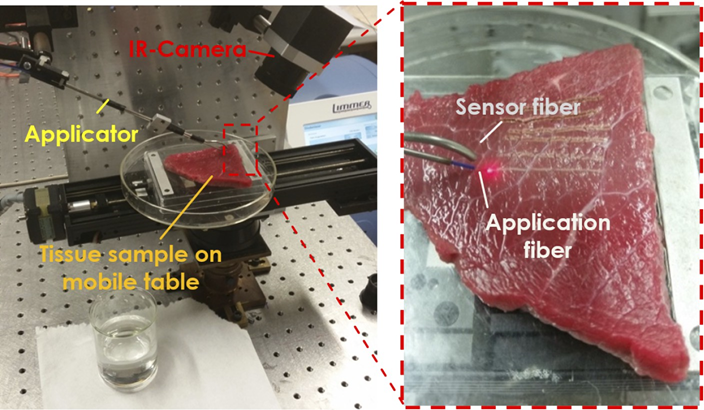 Figure 10: Experimental setup with the prototype of a combined application and sensor fiber exemplified during use on animal tissue.