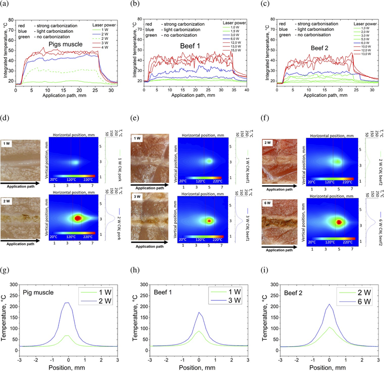 tissue samples (porcine muscle = porcine steak, beef 1 = beef steak, beef 2 = beef roulade). The applicator was moved at a speed of 2 mm/s relative to the tissue. The application laser was operated at a wavelength of λ = 1500 nm in CW mode. (d-f) On the left, the microscope images of samples after applied laser radiation along the application path. The treated tissue (in d is a porcine muscle, in e is beef steak, in f is beef roulade corresponding to a, b and c) is coagulated (top) or begins to carbonize (bottom). The spatial temperature distribution is shown in the middle. On the right, the temperature profile of the respective hotspot is shown. (g-i) Comparison of the two temperature profiles from (d), (e), and (f) running through the respective hotspot.
