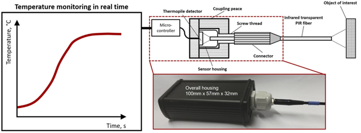 At first, a compact "Fiber pyrometer" for flexible temperature measurement was constructed. It consists of an IR detector MLX90614 (Melexis Inc., USA) with an FOV of 90◦ that is based on the principle of a thermopile; microcontroller; and flexible cable with 0.7 m length based on PIR fiber (art photonics GmbH, Germany) with 900/1000 core/clad diameters surrounded by a protective tubing of Polyether ether ketone (PEEK). The heat radiation is detected by the PIR fiber and passed on to the detector. The whole device is placed into small metal housing with protection from humidity. The measurement data can be read using a microcontroller via a mini USB cable and is plotted on the computer. The cable can be easily changed via an SMA connector. The experimentally determined range of vision of the fiber sensor corresponds to an opening angle of about 31◦ and a numerical aperture of 0.51. The scheme and photo of the device are presented in Figure. 6.