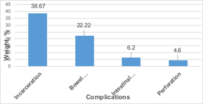 Among the current acute complications diagnosed intraoperatively, the following were noted in order of frequency: incarceration, intestinal occlusion, intestinal necrosis, and perforation. The proportions of these acute complications are graphically represented in Figure.1.