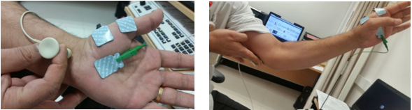 The procedure started by carrying out the sensory testing, by placing the stimulating ring electrodes on digit III (which is more sensitive than digit II4) and the recording electrode on the surface of the median nerve at the wrist. The orthodromic technique was used for the sensory and motor NCS test, through the median and ulnar nerves. A supramaximal stimulus was applied to record the full response of the nerve, at the digits II-IV for median sensory and digit V for ulnar sensory recording. A supramaximal current was applied to stimulate median nerve pathways at the wrist and at the elbow for motor recording from abductor pollicis brevis (APB)1 and ulnar nerve pathways from First dorsal interosseous (FDI). Digit II was stimulated only when either the response from digit III was less than 3µV or absent; digit IV was stimulated only when the response from digit III showed conduction velocity between 45-50m/sec. Amplitude was recorded from peak to peak for sensory responses, and base to peak for motor responses. If responses were not recordable from median sensory digit II, III and motor from APB muscles, then motor responses were elicited by placing recording electrodes on 2nd lumbricals by stimulating median and ulnar nerves at the wrist1,6,11,13. If the motor response from FDI shows more than 30% reduction in amplitude below and across elbow as compared to the wrist, the response elicited from median the nerve while recording from FDI was performed to identify the Martin Gruber anomaly. The distance from APB to wrist was kept between 6.5-7.5 cm while recording the motor median nerve.