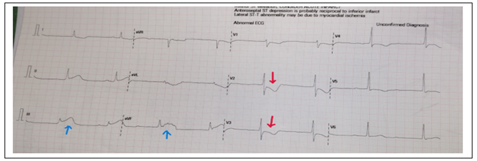 Subsequent ECG done after 2 days showed ST resolution compared to the previous one. Transthoracic echocardiography revealed akinetic basal inferior, posterior wall and basal septum, with preserved systolic function of the other walls andLeft ventricular ejection fraction (LVEF) of 40% with normal diastolic flow pattern.