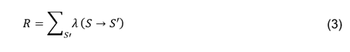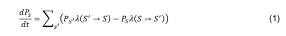 t - time (s); S - the state of the lattice fragment at time t, defined by the occupation numbers si of all nodes, S = (si), i=1,2,…,N2, si ∈ {1,2,3,4}; PS(t) - the unconditional probability of the system being in state S at time t; λ(S′ → S, t) is the transition rate from state S′ to S at time t, with initial conditions Ps(0) = ????????0
