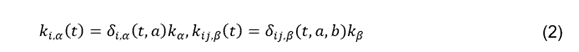 α ∈ {1; 1−; 4} and β ∈ {2; 3; 5; 6; 7; 8} - the numbers of elementary processes (transition stages); i, j ∈ {1, 2, …, N²} - the numbers of lattice node; δij,β(t,a,b) = P(si = a, sj = b) + P(si = b, sj = a/a ≠ b); a and b correspond to the interacting stages of the elementary events with indices α (β); kα, kβ –constants of rates of respective transition stages.