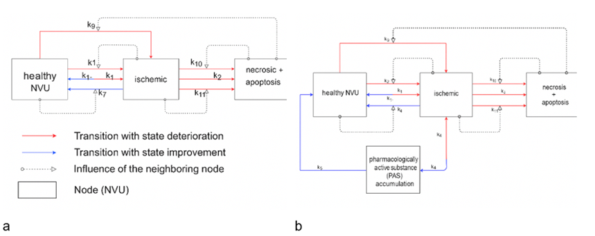 Keywords: ischemic stroke, neurovascular unit; 3D modeling; in silico; Monte Carlo method; cellular automata; pharmacodynamics; computer model