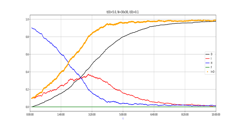 At the same time, other researchers define foci up to 1 centimeter in diameter as small strokes, and foci around 2 centimeters in diameter as large heart attacks, with an average of small foci. Therefore, it seems reasonable to consider a 0.1 centimeter stroke focus as the biological scale corresponding to the modelwe are developing to study the model proposed in this thesis. Along a segment equal to this diameter, approximately 33 high-resolution elements can be placed. Consequently, the 30×30 grid size of the developed model can be considered consistent with the biological characteristics of the modeled object.