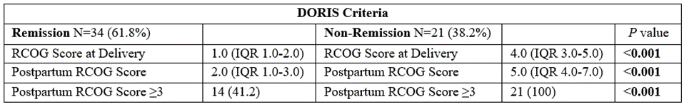 Of the pregnancies in DORIS remission, the median RCOG score at delivery was 1.0 (IQR, 1.0-2.0) and 2.0 (IQR, 1.0-3.0) in the postpartum period (p < 0.001) Table 3.