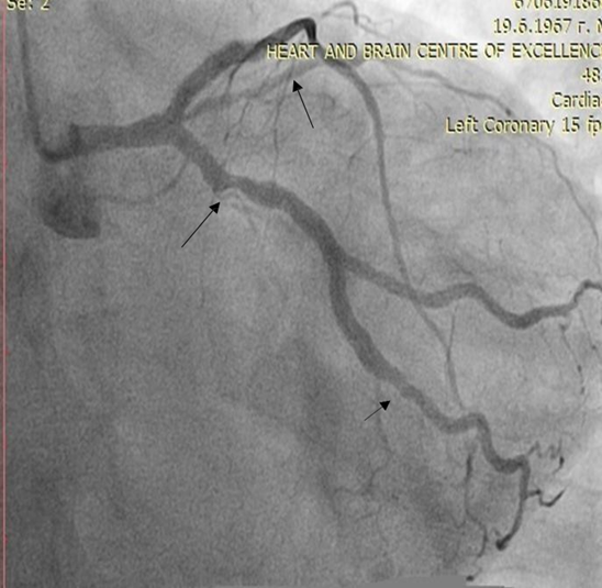 Figure 4: Selective coronary angiography of a 55-year-old woman with established ischemic heart disease, LDL 4 mmol/l, total cholesterol 6 mmol/l, on therapy with rosuvastatin 20 mg/per day. and ezetemibe 10 mg/per day, in which we started treatment with a PCSK9 inhibitor.