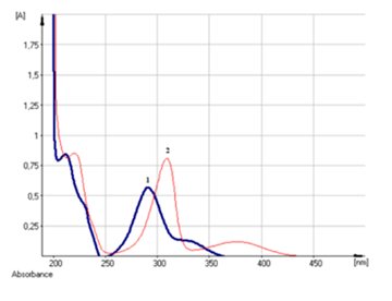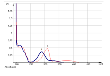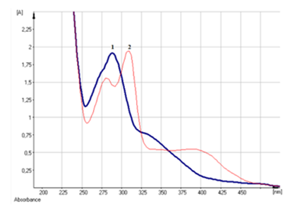 Figure 4 : Electronic spectra of pinocembrin solution Designations: 1 – pinocembrin solution (direct spectrophotometry); 2 – pinocembrin solution with the addition of aluminum chloride.