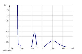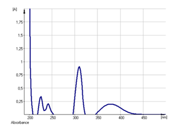 It was observed that adding aluminum chloride to the test solution, as well as to pinocembrin and pinostrobin solutions, caused a bathochromic shift in the long-wavelength absorption spectrum. Additionally, differential spectrophotometry showed that the absorption maxima of pinostrobin and pinocembrin solutions overlap at 310 nm in the short-wavelength region (Figures 7 and 8), while their maxima differ in the long-wavelength region. This finding supports the recommendation of 310 nm as the analytical wavelength. When using pinostrobin CO, the total flavonoid content is recalculated for pinocembrin by applying a conversion coefficient in the formula [14–15]. If pinostrobin CO is unavailable, the experimentally determined theoretical specific absorption value of pinostrobin is used instead.