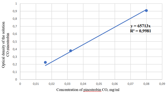 Experimental results showed that the most efficient extraction of flavonoids from naked licorice herb is achieved using 90% ethyl alcohol. The subsequent experiment identified the optimal raw material-to-extractant ratio as 1:50. Extraction time was then optimized, with maximum flavonoid extraction occurring within 60 minutes [23]. Finally, the ideal particle size for thorough flavonoid extraction was determined to be 2 mm. The relationship between optical density and pinostrobin concentration was represented by a linear regression curve over the concentration range of 0.016 to 0.16 mg/ml (0.016; 0.032; 0.08; 0.16) using aluminum chloride at a wavelength of 310 nm (Figure 1).