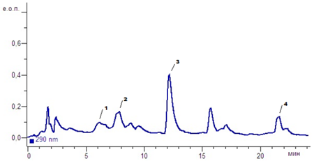 Figure 1: HPLC chromatogram of licorice herb extract: 1 – liquiritigenin; 2 – genistein; 3 – pinocembrin; 4 – isoglabranin.