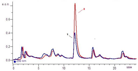 Figure 2: HPLC chromatogram of naked licorice herb extract before and after the addition of pinocembrin: 1 – original naked licorice herb extract; 2 – naked licorice herb extract with added pinocembrin.