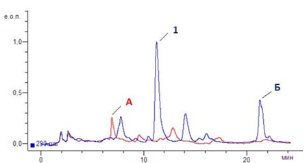 Figure 3: Comparative HPLC chromatogram of the extract of naked licorice and Ural licorice herbs: A – Ural licorice; B – naked licorice; 1 – pinocembrin SS.