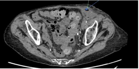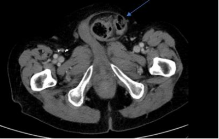 Figure 3: Axial view of CT-abdomen/pelvis showing left-sided inguinal hernia with localised perforation