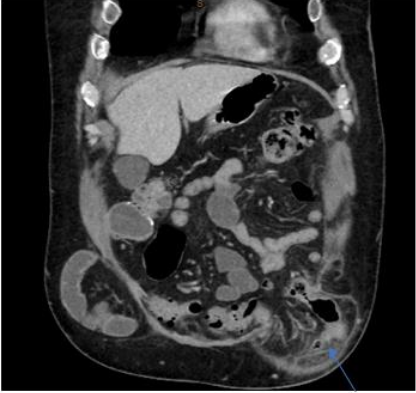 Figure 1: Coronal view of CT-abdomen/pelvis showing incarcerated left-sided inguinal hernia