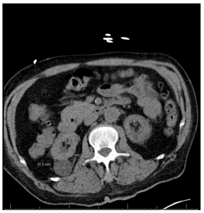 Figure 2 : CT abdomen/pelvis showing a right iliac artery aneurysm that measures 3.1cm x 2.8cm