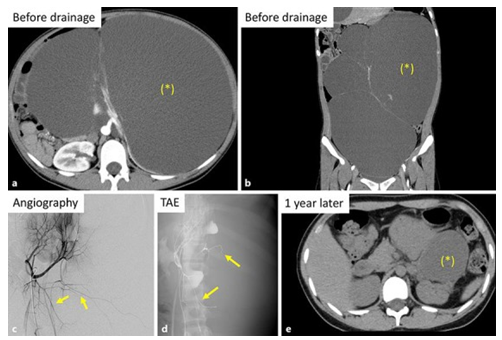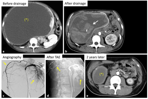 Jaber and Ataya [24] reported an 86-year-old woman who had a history of orthotopic liver transplantation related to non-alcoholic steatohepatitis, stage 4 chronic renal disease secondary to calcineurin inhibitor toxicity, as well as paroxysmal atrial fibrillation and who was taking apixaban medication. She manifested with sudden right-sided abdominal pain which had radiated to her flank region. She was initially found to be hypotensive and she had tachycardia and following administration of intravenous fluids she responded well and became normotensive. The results of her initial haematology and biochemistry routine blood tests demonstrated a haemoglobin of 110 g/g/L, which rapidly dropped to 93 g/L, and her serum creatinine was 4.09 mg/dL which had risen from her baseline serum creatinine level of 2.46 mg/dL. She had a non-contrast computed tomography (CT) scan of abdomen and pelvis which demonstrated a hyper-dense right kidney with encompassing haemorrhagic fluid as well as stranding. She also had a history of bilateral simple kidney cysts related to her chronic kidney disease. In view of the fact that she did not have a history of trauma, it was presumed that she had developed spontaneous haemorrhage into one of her simple kidney cysts. Pursuant to a multi-disciplinary team meeting discussion between Urologists and Interventional radiologists it was decided that the patient should undergo renal artery angiography with the possibility of embolization of the arterial branch supplying the bleeding renal cyst. Selective renal artery angiography demonstrated multi-focal areas of active haemorrhage from both the superior and inferior poles of her right kidney. Following multiple passes to the third-order branches of her right renal artery, about 70% to 80% of her right was estimated to have been embolized. Pursuant to the embolization procedure, the lady’s haemoglobin became stable. She did experience persistence of supra-pubic pain as well as right loin pain, which did resolve 48 hours pursuant to her embolization procedure. The rest of her post-procedure stay was uneventful till she was discharged from the hospital. Jaber and Ataya [24] made the ensuing pertinent iterationsReports within the literature related to the treatment of renal intra-cystic bleeding by means of trans-catheter arterial embolization is scarce or rare as was undertaken with regard to their patient. [3]