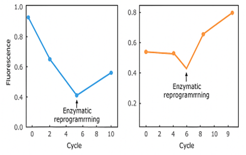 Figure 3: Fluorescence output and recombinant activity were simulated to assess logic gate behavior. After several cycles, gates with looped feedback showed adaptive damping of signal, mimicking refractory logic. Upon introducing enzymatic reprogramming, the circuits rewired to restore signal strength-a form of digital long-term potentiation.