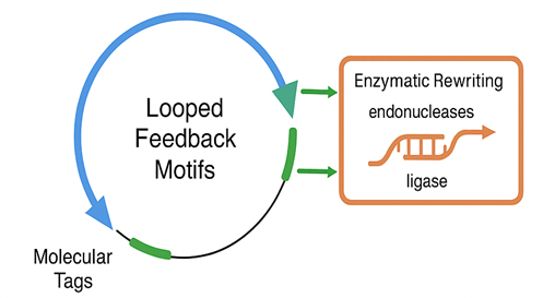 Figure 2: Schematic overview of the plasmid construct for the Titan DNA com-puter. The diagram illustrates the closed-loop logic motifs (blue), molecular tags (green), and enzymatic rewriting modules (orange), integrated into a circular DNA vector. Arrows indicate the flow of logic control and feedback.