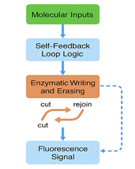 Figure 1: Experimental Simulation Design. Flowchart illustration depicts the simulation design for DNA-based computations, which includes molecular inputs triggering a self-feedback logic loop, enzyme-mediated writing and erasing of DNA sequences.
