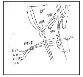 Figure 8: Hypoglossal nucleus and hypoglossal nerve.BP: Basilar Pons. ME: Medulla oblongata. IV: Ventricle IV. ANU: Abducens Nucleus. ANE: Abducens Nerve. FNU: Facial Nucleus. HyNU: Hypoglossal Nucleus. HyNE: Hypoglossal Nerve.. ITM: Intrinsic Tongue Muscles. GM: Genioglossus Muscle. HYM: Hypoglossus Muscle. STM: Styloglossus Muscle.