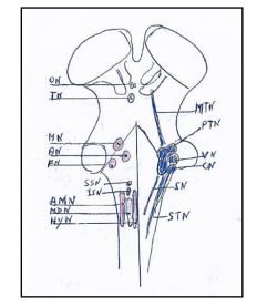 Figure 4: Nuclei of origin of the vagus nerve mediolaterally. 1. Nucleus ambiguus or Ventral nucleus of vagus nerve. 2. Nucleus cardiopneumoenteric or Dorsal nucleus of vagus nerve. 3. Sensory dorsal of vagus nerve. 4. Solitary nuclei. 5. Sensory nucleus of trigeminal nerve.