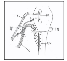 Figure 6. Nucleus ambiguus and nuclei of accessory nerve. NA: Nucleus ambiguus. ASN: Accessory spinal nucleus. 1: Nervus vagus. 2: Vagal root of accessory nerve; 3: Spinal root of accessory nerve. 4: Trunk of accessory nerve. 5: Internal branch of accessory nerve or vagal communicating branch to laryngeal muscles. 6: External branch of accessory nerve or spinal accessory nerve to trapezius and sternocleidomastoid muscles. JF: Jugular Foramen. FM: Foramen magnum. Figure modified from: Kierman J.A. Barr: Il sistema nervoso dell’uomo. A cura di Cocco L, Gaudio E, Manzoli L, Papa M. Edises p. 149. 2013.