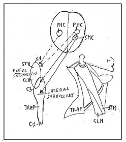 Figure 7: Subnuclei of the accessory nerve. Medial subnucleus extend between C1-C3 spinal segments innervating the muscles: sternomastoid muscle (STM) and Cleidomastoid CLM). Lateral subnucleus innervating the muscles: Cleidomastoid (CLM) and Trapezius (TRP). C1: First spinal segment. C3: Third spinal segment C7: Seventh spinal segment. PMC: Primary motor cortex. SMC: Supplementary motor cortex. Figure modified from Benninger and Mc Neil [14].