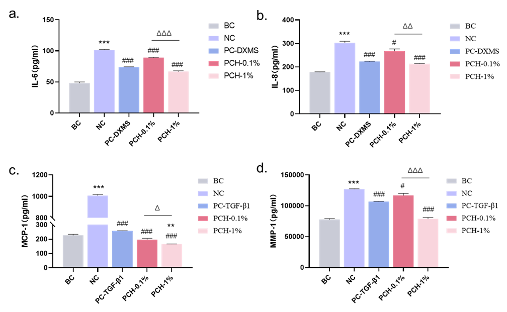 Figure 3a-d: The effect of PCH extract on content of IL-6 IL-8 MCP-1 and MMP-1 in H2O2-induced fibroblasts was determined by ELISA. n=3 each.