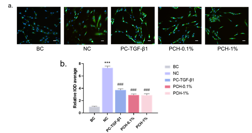 Figure 4: Effect of PCH extract on γH2A.X protein expression in H2O2-induced fibroblasts. (a): Immunofluorescence staining results of γH2A.X in each group, Scale bar: 50 μm; (b): Relative IOD average of γH2A.X in each group. n=3 each.