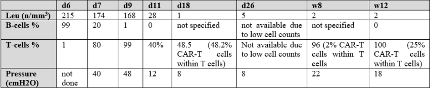 Table 1: CSF laboratory values; Leu, leucocytes; n, number; %, percentage of total lymphocytes in FACS, d, days after CAR-T cell administration; w, weeks after CAR-T cell administration.