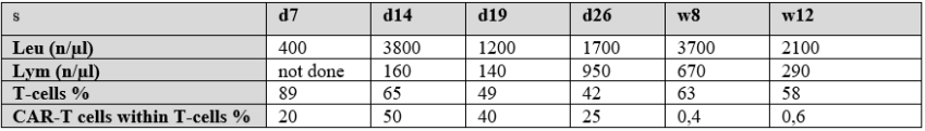 Table 2: Peripheral blood laboratory values; Leu, leucocytes; n, number; Lym, lymphocites; T-cells %, percentage of total lymphocytes in FACS; d, days after CAR-T cell administration; w, weeks after CAR-T cell administration
