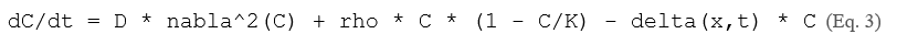 introduces a density-dependent brake but retains the homogeneity assumption. In contrast, PDE formulations such as the reaction-diffusion model of tumor invasion: