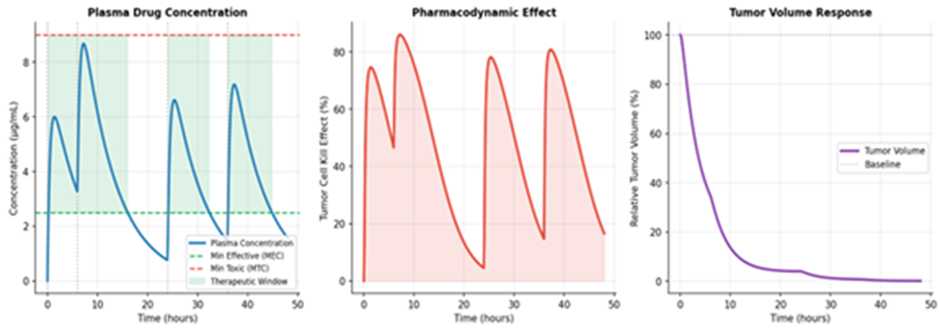 Figure 3: PK/PD Chemotherapy Model: Plasma Concentration, Pharmacodynamic Effect, and Tumor Volume Response