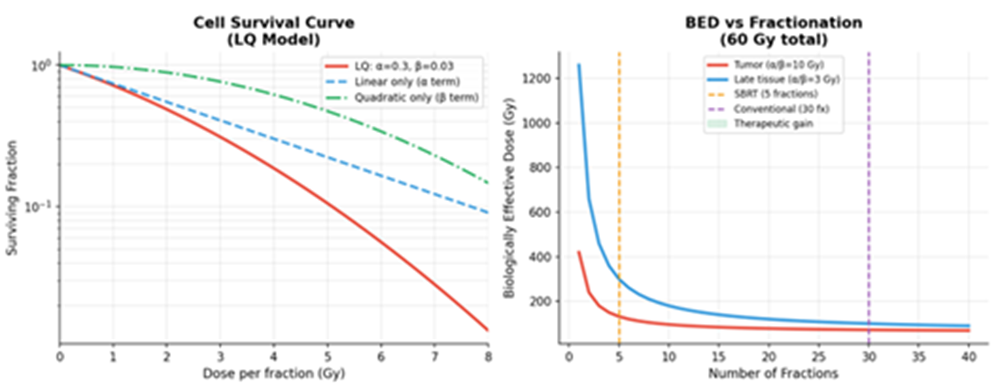 Figure 4: Radiotherapy LQ Model: Cell Survival Curves and BED vs. Fractionation Comparison.